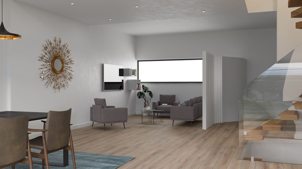 No dois lotes o piso térreo é composto por um hall de entrada, um bengaleiro e um lavabo, sendo os restantes espaços interligados entre si em open-space. Destes, temos a nascente, a sala de estar e a poente, a cozinha e sala de refeições. Como elemento central temos o acesso vertical. O alçado poente, neste piso, contempla um grande vão de correr com acesso ao jardim tardoz, onde propomos uma zona em Deck, jardim relvado e floreiras.
