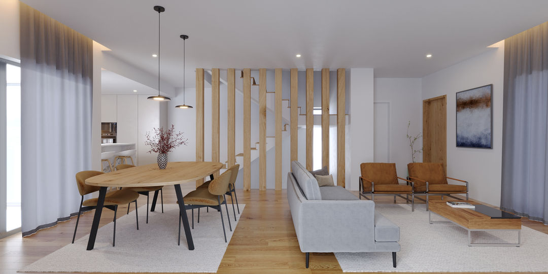 O exterior é marcado por materiais como ripado de madeira, grés cinza, elementos metálicos cinzas e pintura branca.